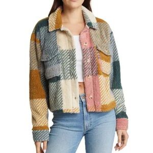 THREAD & SUPPLY Fleece Multi-Color Plaid Button Down Boho Crop Jacket Size XS