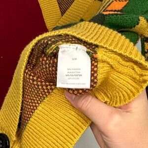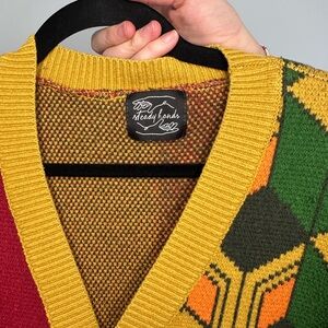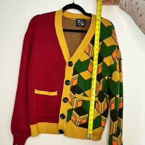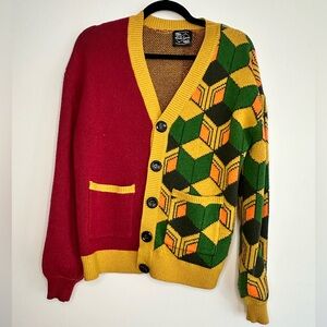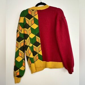 Stand out with this vibrant men's sweater featuring a bold geometric pattern. The rich red and green hues are complemented by striking yellow accents. Perfect for adding a pop of color to your wardrobe.