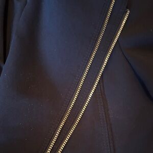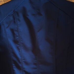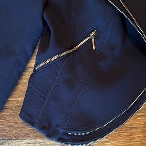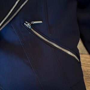 Cute navy blue moto jacket with silver zipper detail and curved hem in front! Back has detailed stitching and straight hem! Zippered pockets on front! Only wore once! Great jacket for work or going out at night!