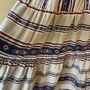 Preowned condition, no flaws to note. No tags anywhere on skirt. May be handmade/homemade. Unlined. Elastic waistband. Very full tired skirt with southwestern striped pattern.