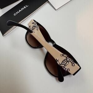 CHANEL 5455QA C501 S5 Sunglasses Cream Leather CC Interlocking Chain Black USED