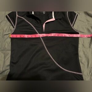 Stylish black tee with pink accents. Short sleeves. Comfortable fit. Perfect for casual wear. Activewear