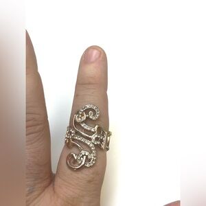 This stunning ring features an elegant swirl design in gold and silver tones, perfect for adding a touch of sophistication to any outfit.