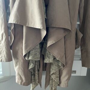 Elegant vintage Alexander McQueen tan trench coat with draped front with lace inserts. Excellent condition. Made in Italy. 100% cotton. Perfect for layering.