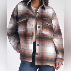 Chic plaid shirt jacket by Elan. Features a blend of black, brown, and white tones. Perfect for layering.
