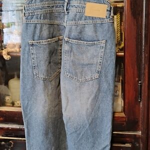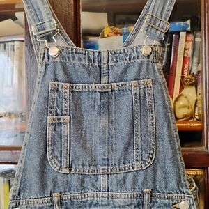 Stylish distressed denim overalls. Features front pocket and adjustable straps. Perfect for casual wear.