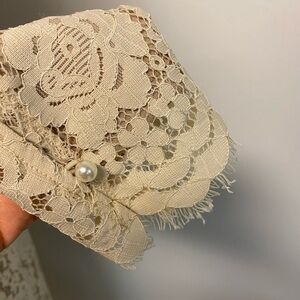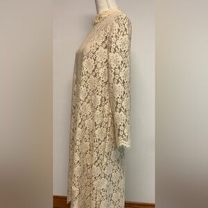 Excellent condition! This modest elegant cream lace dress is perfect for any occasion. Its intricate design and pearl detailing offers a timeless look.