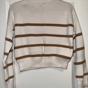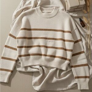 Cozy sweater with cream and tan stripes. Perfect for casual wear.