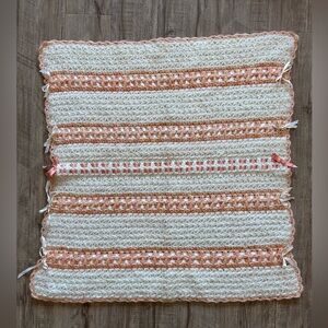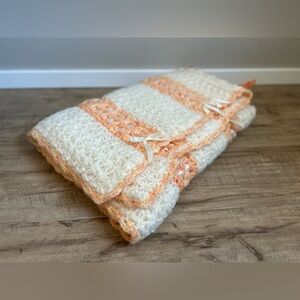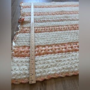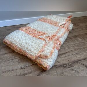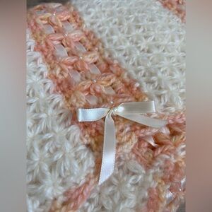 Beautiful handmade crochet blanket in cream and peach. Soft and cozy design with ribbon detail. Choking hazards ( beads ) and ribbons on blanket. Use caution. Perfect for a photography prop