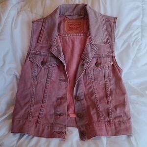 Stylish, distressed pink denim vest with button closure. Features two front pockets. Perfect touch over a long maxi dress. Very unique piece. Excellent condition.