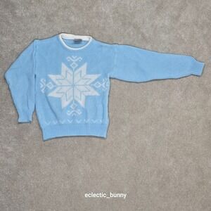 Vintage knit sweater features a large white snowflake graphic on a light blue background, perfect for winter layering. Crafted in Hungary, this acrylic pullover includes a classic crew neck with a white contrast trim and ribbed cuffs and hem for a snug fit. The medium-weight knit provides warmth without being overly bulky, making it a versatile choice for cold-weather activities or holiday gatherings.