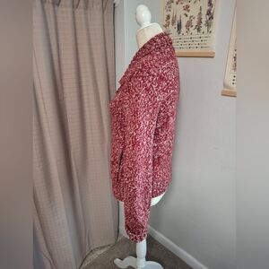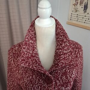 Vintage button up cardigan sweater, red with cream. 2 front pockets, no rips or stains.