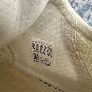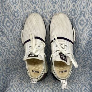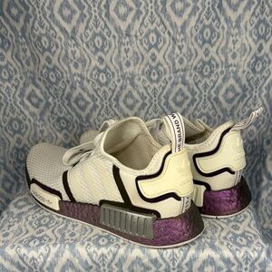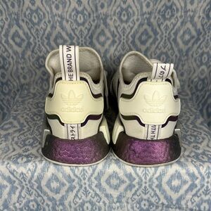 Adidas NMD sneakers in cream with bold purple details. Sleek and modern style.