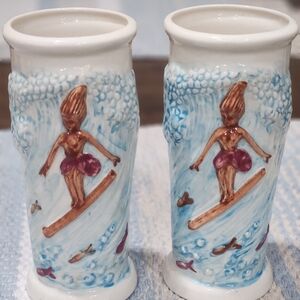 Vintage Surfer Girl Tiki Mugs Bud Vases Taiwan Bamboo Set Of 2