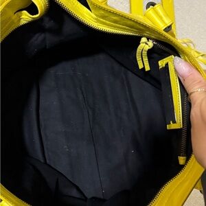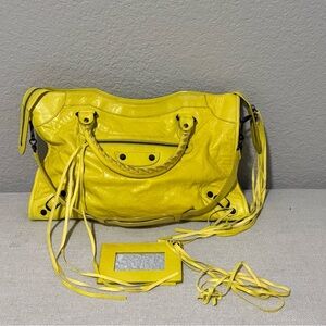Authentic pre-loved Balenciaga Le City Shoulder bag. Bright yellow. As is condition- there are marks and stains that I tried to capture in all the photos. Please ask for more if interested. Interior is clean, nothing to note. No rips or tears. Measures 15in across- medium size.