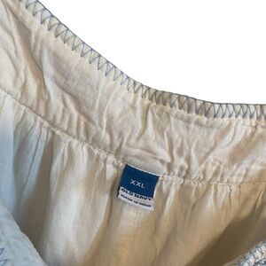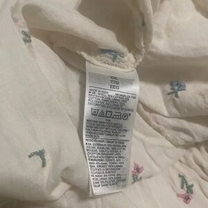 Embroidered trim along shoulder straps, neckline, and waist.