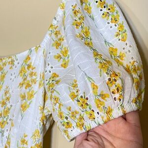 Charming white dress with yellow floral pattern. Features puff sleeves and eyelet details. Perfect for a sunny day.