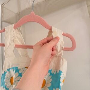 Mini Boden girls sun dress features a vibrant blue and white daisy floral print with a smocked back for a comfortable, flexible fit. The design includes a square neckline, thick scalloped straps that cross in the back, and a gathered waist that flows into a full skirt. Crafted from a lightweight cotton fabric, this piece is ideal for summer outings, garden parties, or casual play. Note that there is a small faint yellow spot on the right shoulder strap as shown in photos.