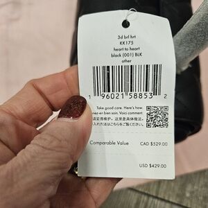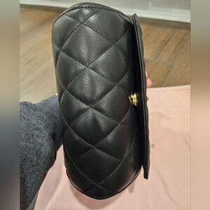 Gorgeous black quilted smooth leather exterior features a cute 3D heart barrel design, making it a perfect gift for someone special. The bag is adorned with gold tone hardware and has a single handle with a 2.5" drop to use as a handbag, as well as an adjustable crossbody strap to convert her instantly!