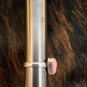 For your consideration is this beautiful sterling silver "Queen Pink Conch Heart" ring, which is a striking piece of Southwestern or Native American-style jewelry. The ring features a heart-shaped, polished pink conch shell cabochon set in a solid-back sterling silver setting. The stone is a soft, milky pink color and may show subtle color variation. The ring's 3.6 mm band is also made of sterling silver and the impeccable craftsmanship highlights the natural beauty of the pink conch, making it the central focus of the piece. This type of ring is often associated with the Southwest.