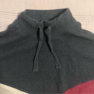 Cozy sweater with a stylish tri-color design. Features a mock neck and comfortable fit. Perfect for casual wear. Great condition, colors are maroon, charcoal and tan. 100% Organic Cotton