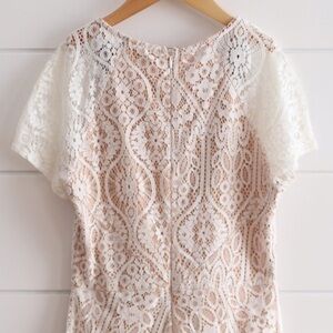 A beautiful white lace dress with a nude lining. Short cap sleeves and a high/low hem line. This dress has a back zip closure.