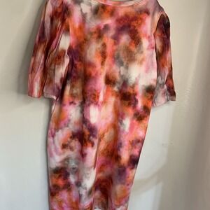 The Chicos French Terry Tie-Dye Poof Sleeve Pockets Cotton Dress Shirt in size 2 (US XL) is a stylish and comfortable pullover dress perfect for travel, activewear, or casual outings. Made from a blend of cotton, modal, and spandex, this dress features a crew neck, 3/4 raglan sleeves, and an elastic band waist for a relaxed fit. The ombre/tie dye pattern creates a trendy look, while the thumb holes and thumb sleeves add functional details. With a breathable French Terry fabric and machine washable care, this versatile dress is suitable for year-round wear in any season.