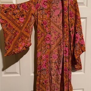 Vibrant floral maxi dress by Spell. Features bold orange and pink patterns. Flowy silhouette with long sleeves. Robe tie gorgeous great condition