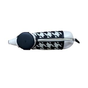 Kate Spade New York Claude Dachshund crossbody bag. Black and white houndstooth sweater and black beret.