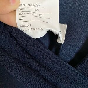 After six 6797 midnight xs, new without tags, no visible flaws, size chart included, 96% polyester, 4% spandex, v-neck