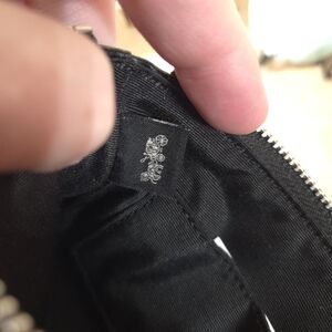 Chic Coach denim wristlet with signature pattern. Compact and stylish. Ideal for essentials.