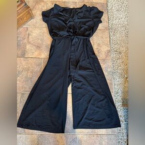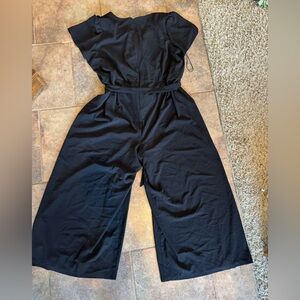 Chic black jumpsuit with wide-leg design. Features a flattering fit and stylish silhouette. Has pockets Perfect for versatile wear.