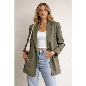 capsule wardrobe minimalist neutral olive blazer lightweight layering piece effortless chic relaxed tailoring normcore aesthetic coastal casual resort wear travel friendly spring fall closet staple modern simple elevated everyday jacket. Modeled on an AI-generated model to show styling potential. See listing photos for the actual item.