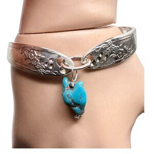 This bracelet, crafted from vintage silverware, features intricate floral engravings and a unique turquoise stone charm. The adjustable design adds versatility, while the repurposed material offers an eco-friendly touch. A timeless accessory blending elegance and sustainability.
