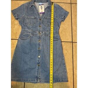 Chic denim mini dress. Features button-down front. Short sleeves and collar. Perfect for casual outings. Waist about 17” like new condition