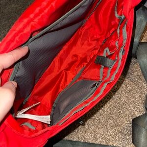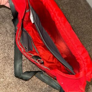 Bold red Patagonia messenger bag. Features front zip pocket and adjustable straps. Ideal for daily use. 12L