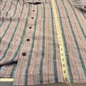 Features a vertical stripe pattern in blue, gray, and subtle red tones with a classic button front, chest pocket, and side vent hems for breathable comfort and mobility. Designed for warm weather and travel, this shirt combines flax and viscose for a cool, airy feel with a relaxed drape. Perfect for vacations, outdoor wear, or casual everyday comfort.