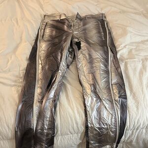 Elegant pants with a sleek metallic finish and zipper details. Some metallic finish wear throughout the pants