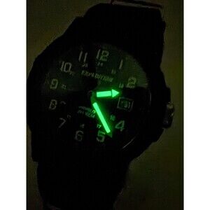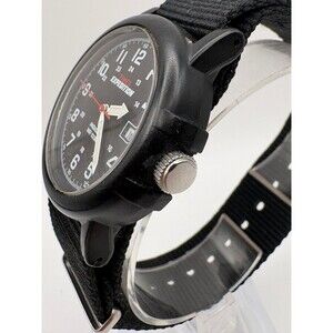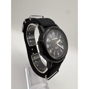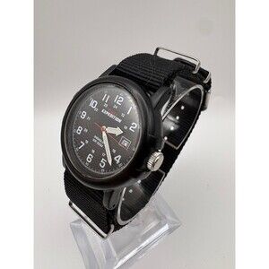 Up for sale is a rugged Timex Expedition Indiglo field watch, featuring a durable black resin case and a high-visibility black dial. This model is built for serious outdoor use, with a water resistance rating of 100 meters (WR 100M) and the legendary Indiglo night-light that illuminates the entire dial at the press of the crown. The stainless steel case back is engraved with model identifiers 905 and 45 and specifies the required CR 2016 cell battery. This watch has been thoroughly cleaned via an ultrasonic cleaner to ensure it arrives in top condition. A brand new battery fitted ensures reliable quartz movement performance. The black nylon NATO-style strap is in used condition but remains sturdy and comfortable for daily wear. This versatile timepiece includes a date window and 24-hour military time markings. Brand new battery fitted. Used strap.