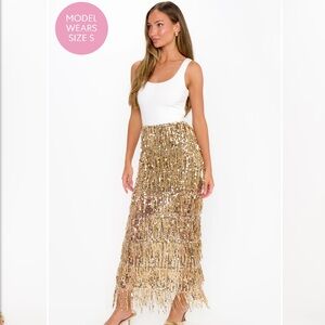 The Sadie Maxi Dress is made to shine, literally! This two-fer pairs a comfy stretch top with a dazzling gold sequin maxi for that perfectly tucked tank-and-skirt look in one effortless piece