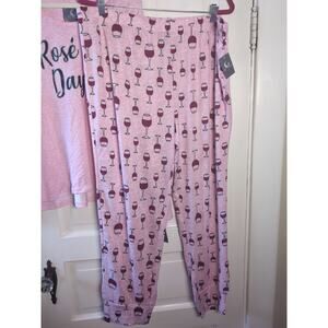 The PJ Couture Women's Sleep Set in Rose Au Day Wine Pink, size 2X, is a cozy and stylish pajama set perfect for any season. Made from a blend of polyester and spandex, this knit set features a wine pattern with glitter accents, a pull-on closure, long sleeves, and a round neckline. The pink color and rose theme add a touch of femininity to this comfortable and lightweight sleepwear set, making it a must-have for any woman's sleepwear collection. Machine washable for easy care, this set is a versatile addition to any wardrobe. Pit to pit,25"Length 27" Waist 42" Inseam 29"