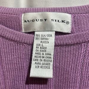 Elevate your wardrobe with this stylish August Silk purple knit top. Perfect for any occasion, this top offers comfort and elegance. 70% silk and 30% cotton. 18” pit to pit relaxed. Stretches to about 22” pit to pit. 21" length.
