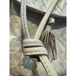 Basket weave front design with magnetic flap to leather tassels. Delicate and feminine knot tie shoulder strap with eight inch drop. Interior has zip side wall and lg. slip pocket. Bottom sides has snaps for extra space.