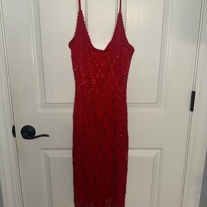 Chic beaded red midi dress with delicate straps. Perfect for elegant outings or a beach trip. Seems to have a good amount of stretch to it