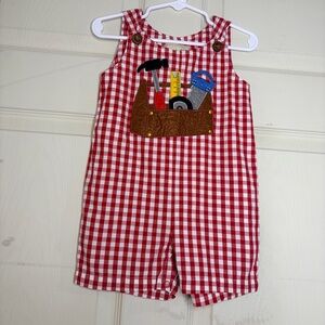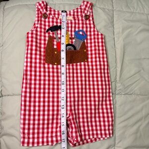Toffee Apple boys red gingham jon jon romper in size 12M.