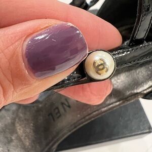 CHANEL DARK GREY METALLIC & patent leather ankle strap heels pearl CC 06P 35.5