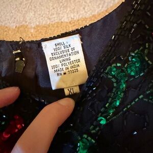 Chic black blouse with vibrant red and green floral embroidery. Perfect for versatile styling. 100% Silk