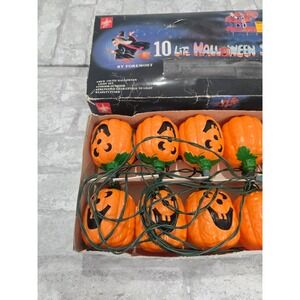 This lot of 10 vintage Halloween Jack-o-lantern blow mold pumpkin string light covers is a perfect addition to your Halloween decor. Made of orange plastic and dating back to the 1990s, these miniature light covers are sure to add a nostalgic touch to your holiday celebrations. The classic design and high-quality material make them a must-have for any Halloween enthusiast looking to add a unique and festive touch to their home.
