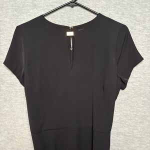 Never worn, plastic on Buckle.Sleek sophistication defines this effortlessly stylish black dress. Featuring a classic sheath silhouette that gracefully skims the body, this dress is the epitome of refined simplicity. A tasteful keyhole neckline adds a touch of allure, while the coordinating belt, adorned with a gleaming gold buckle, cinches the waist for a flattering fit. The smooth, comfortable fabric drapes beautifully, ensuring both elegance and ease of movement. Perfect for a business meeting, a cocktail party, or a sophisticated dinner date.