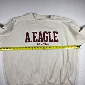 American Eagle cream crewneck sweatshirt featuring A EAGLE embroidered logo with Let Love Shine graphic detail. Pullover style with ribbed cuffs and hem. Perfect for casual outings or relaxed weekends.